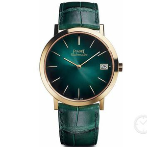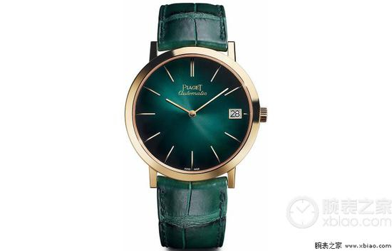 腕表点评:1957年,伯爵推出了一款颠覆制表界的超薄腕表,重新诠释了优雅戴表的定义。而在今年,为庆祝这款制表界的典范诞生60周年,伯爵隆重推出了呈献其超薄优雅理念的Altiplano限量版腕表系列,再现非凡卓越的当代杰作。作为其中的一枚限量260枚腕表,整枚腕表由闪亮的黄金表壳萦绕着松绿色表盘,逐渐幻化为翡翠色调,表盘搭配18K黄金时标和修长的巴顿指针并配一条松绿色的鳄鱼皮表带,与表盘颜色相互呼应。搭载伯爵自制1203P超薄自动上链机芯,拥有中央小时、分钟显示功能,日期显示设于3时位置。透过蓝宝石水晶透明底盖,可尽览精美机芯和深灰色摆陀。