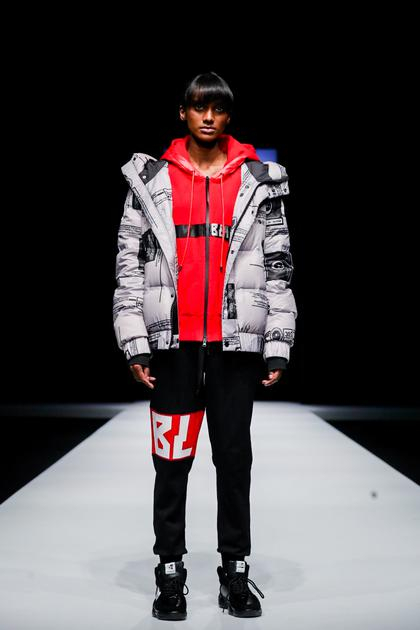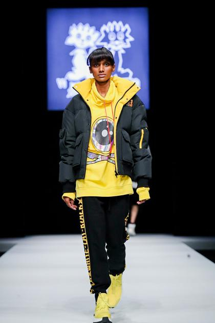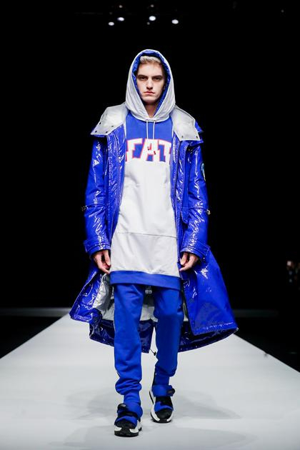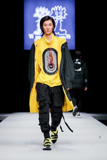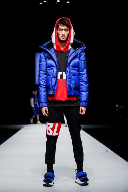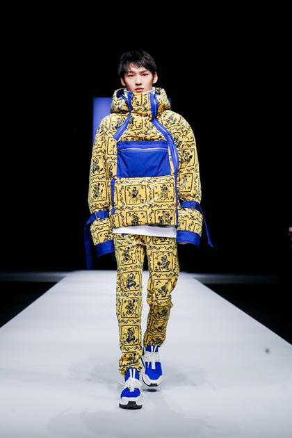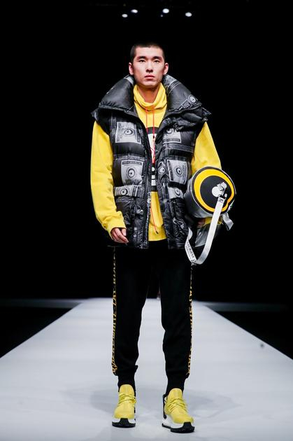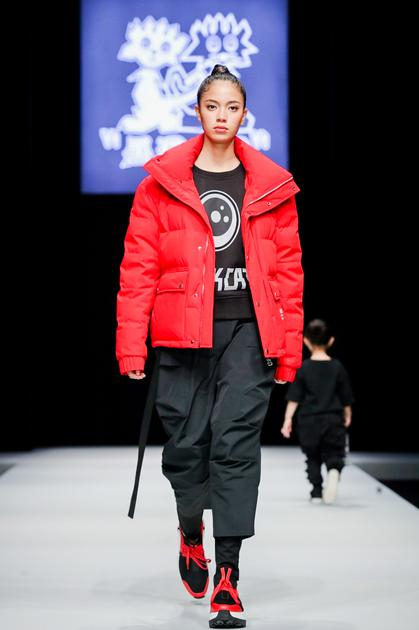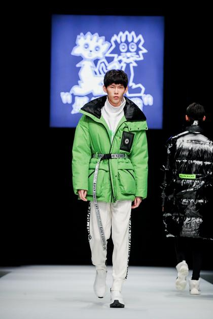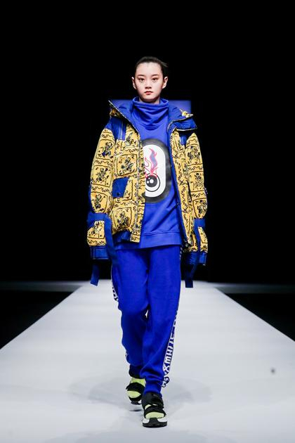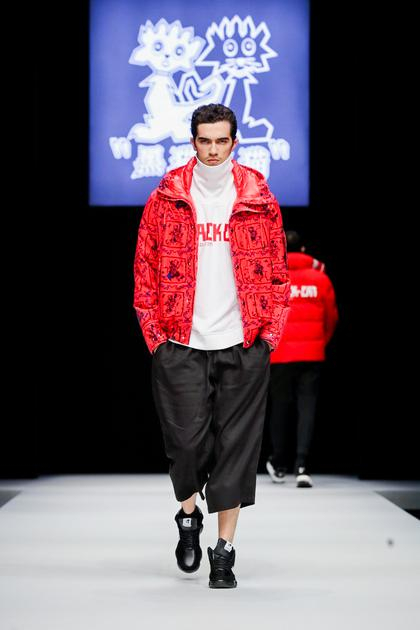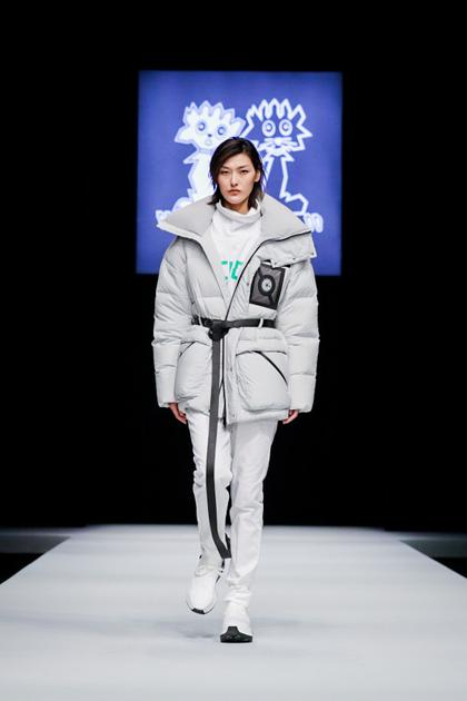 整场发布不仅是对色彩的完整诠释,更对羽绒服的设计做了全面探索。长短款型,背心夹克,绗缝线技,显示设计师对廓形与技术的综合把控。而满印LOGO字母的条带,独创的图案点缀(突出的如一只眼燃起了火焰、白猫黑猫并肩行的LOGO图案),以及年轻人喜欢的徽章及文字、字母等,均丰富了每一套造型。