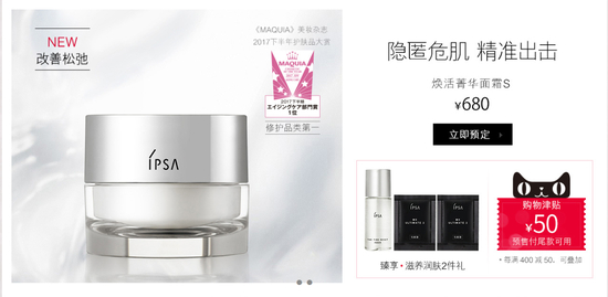 除了以上优惠之外,最推荐的还有IPSA最新升级的焕活菁华面霜!去年日本上市时就获得了MAQUIA杂志护肤大赏的专业级抗老产品,分为S型紧致版以及G型抗皱版,针对松弛和细纹两种不同症状的初老问题,也很适合仙女们在此次优惠中购入呢!