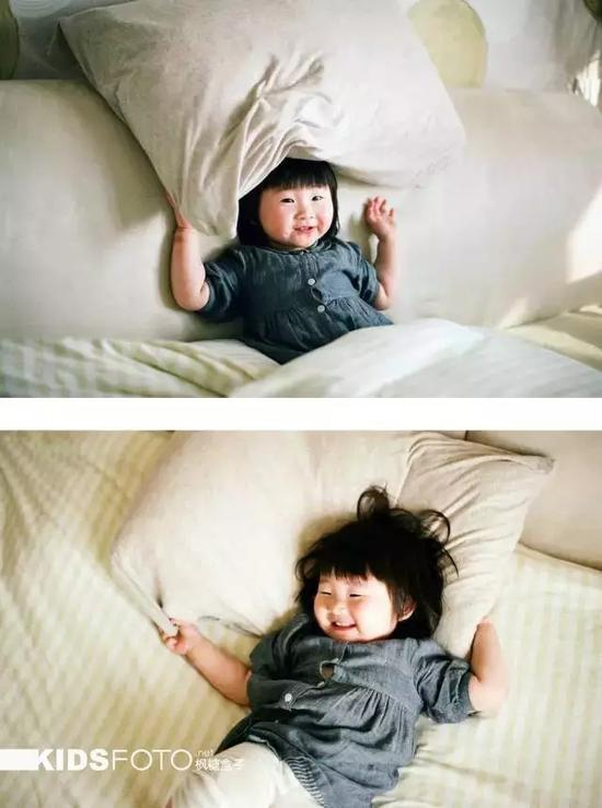和爸爸在玩枕头大战(muji的淡色床单和深色衣服组合,然后用连拍进行抓拍,最后找到表情最自然的)。