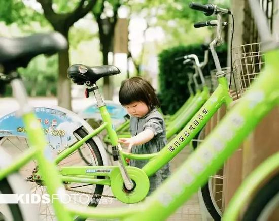77在玩公共自行车(充分利用身边道具,构图将主体放在画面中点,透过道具进行切入拍摄,记住运用大光圈,将前景虚化掉)