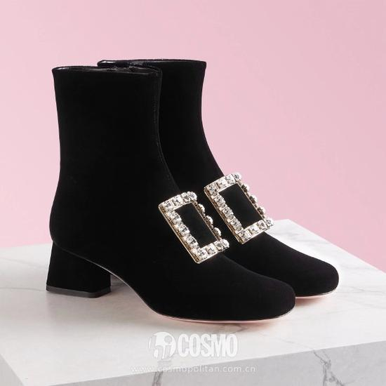 唐嫣选择的这双麂皮短靴上缀以星星水晶logo装饰,但Roger Vivier的经典标志是优雅方扣。这双装饰在靴子一侧的方扣短靴是品牌秋冬季节最走俏的短靴款式,一卖就是好几年。