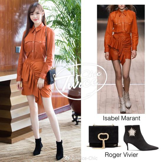 但她这套麂皮鞋包相呼应的裙装look还是可以学起来的。