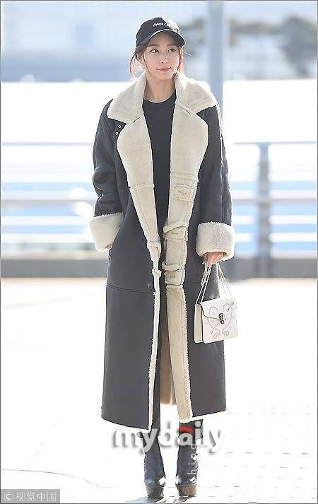 韩艺瑟头戴黑色棒球帽,身上这件棕色翻领皮毛一体大衣外套带来十足质感,搭配黑色九分牛仔裤和黑色防水台高跟靴,手拎白色Bvlgari蛇头包,整个以保暖至上的搭配中也不乏时尚的影子。