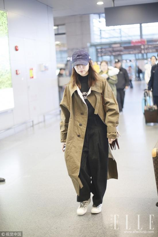 董洁这身LOOK也是酷感十足,头戴涂鸦牛仔布棒球帽,身穿卡其色风衣,下搭条纹阔腿裤和小白鞋,简洁的穿搭同样能带来强大气场。