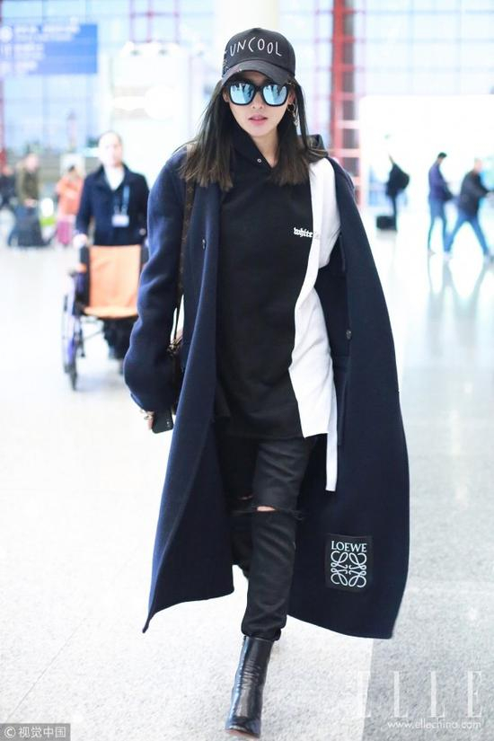 张天爱头戴黑色棒球帽,身穿Loewe藏蓝色毛呢大衣内搭黑色连帽卫衣,下身穿紧身破洞裤,脚踩高跟踝靴,对这种走路都带风的酷帅造型张天爱信手拈来。