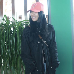 刘雯就身体力行做起了示范,一身颇具质感的黑色风衣外套下搭牛仔裤,头戴粉色绸缎棒球帽,你还会觉得造型过于暗沉吗?俨然一枚甜美Girl!