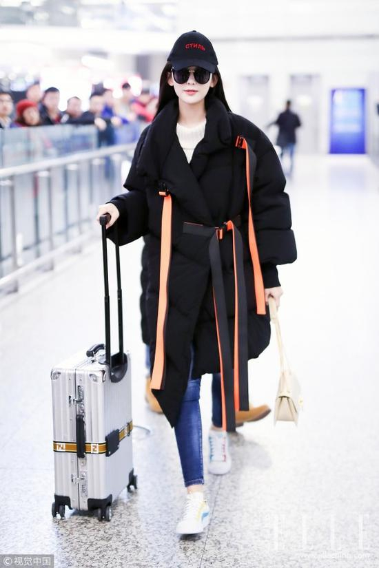同样选择黑帽搭黑衣的古力娜扎则头戴Heron Preston黑色棒球帽,身穿Chris by Christopher Bu橙色飘带翻领收腰羽绒服,下搭紧身牛仔裤和Puma X Michael Lau拼色小白鞋,明亮的橘色飘带不仅打破了色彩的枯燥更带来飘逸感。