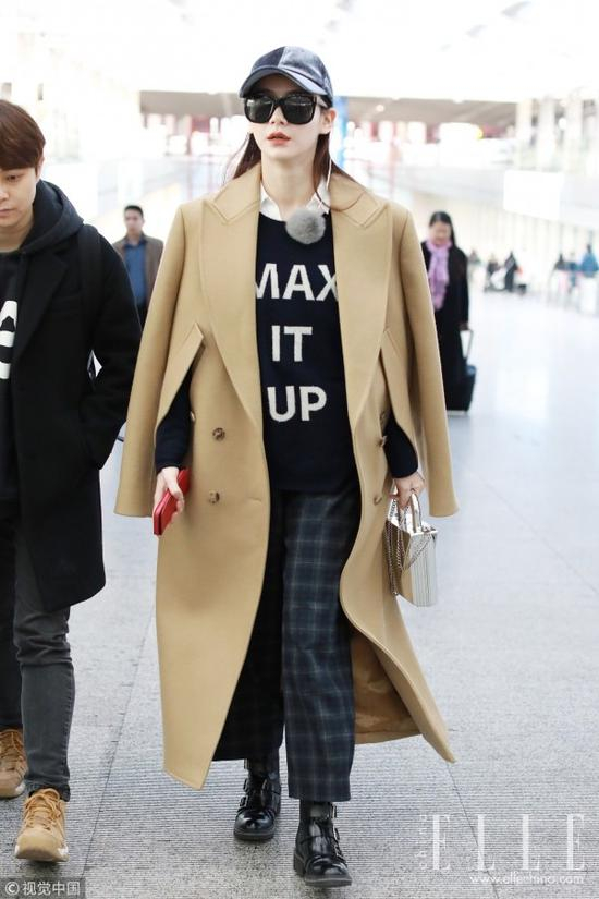 戚薇也深谙此道,头戴黑色棒球帽身穿卡其色斗篷翻领西装毛呢大衣,下搭墨绿色格纹呢面阔腿裤,脚踩搭扣机车靴,极具魅力。