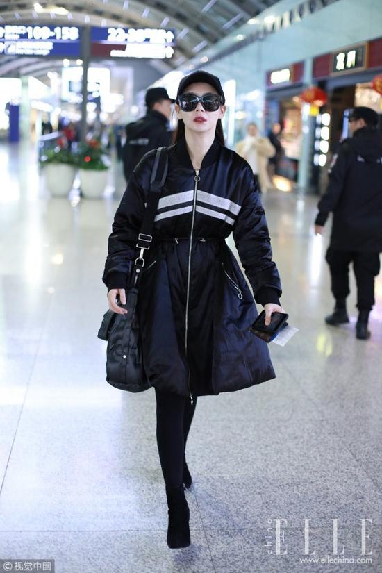 戚薇这身行头则恰恰相反,Christopher Bu黑色收腰棉衣连衣裙搭配Pedro黑色麂皮粗跟踝靴,全身上下包括配饰无一例外选用了黑色,戚薇耍起酷来真的是男友力MAX!