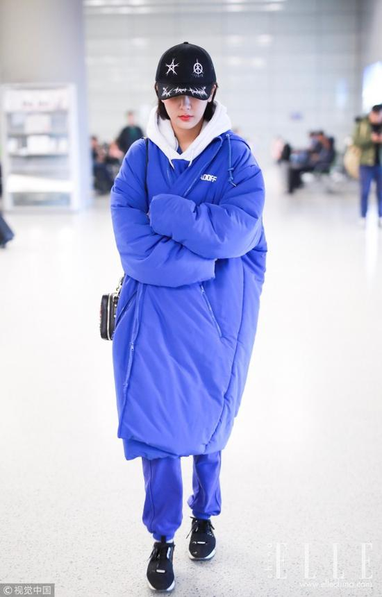 杨紫身穿蓝色Oversize棉服,下搭同色运动裤和黑色运动鞋,头戴五角星反战涂鸦棒球帽,安静乖巧,一副低调的运动style模样。