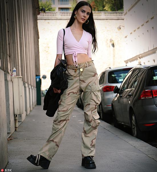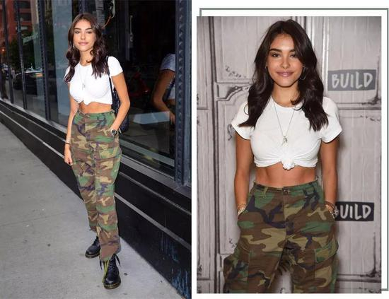 除了宋茜在节目中上身的经典迷彩工装裤,纯色款更加百搭。Romee Strijd选择了基础款露腹T恤,修身且轻薄,下装轮廓感分明的工装裤被聚焦。