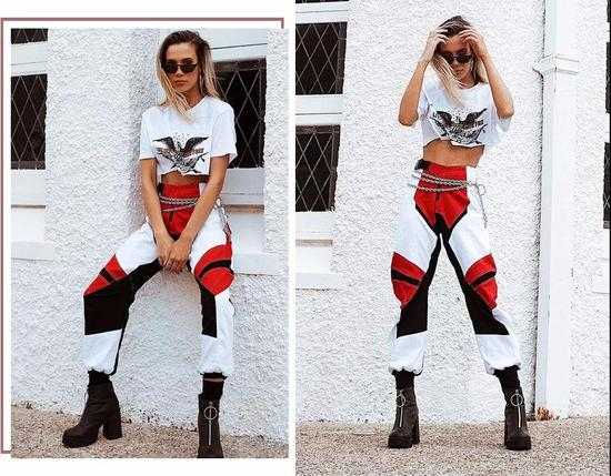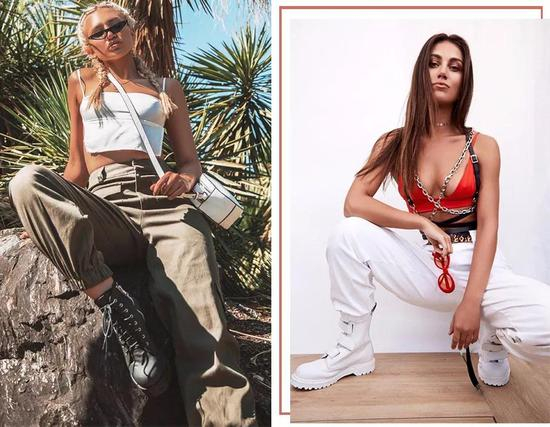 束口设计回潮,运动布料的工装裤也逐渐走入大众视野,搭配croptop和裸靴,营造“兵味女孩”的别样潮范儿。