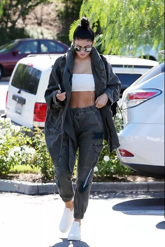 紧实的小腹和流畅的线条在夏天怎么能忍住不露出来?如果像Kylie这样身材丰满的姑娘们也想穿露胃装扮酷,可以用过臀的长外套跟短打Crop搭配。