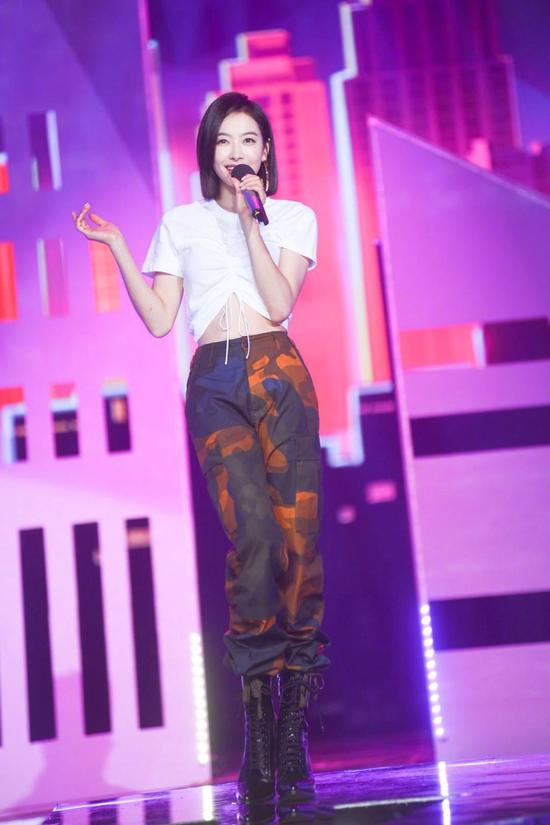 背心搭配迷彩工装裤的穿法鞠婧祎也做过尝试,还好这次没有选择这套LOOK,否则就真的“一模一样”了。