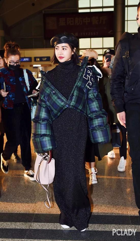 Jolin蔡依林身上的短款格纹外套竟然也是件羽绒服,视力5.0的小编,只看见蔡依林身穿潮牌格纹短外套,配上贝雷帽、长裙,腿长一米八。对于这款格纹印花羽绒的喜爱,可以从多次机场LOOK得知。