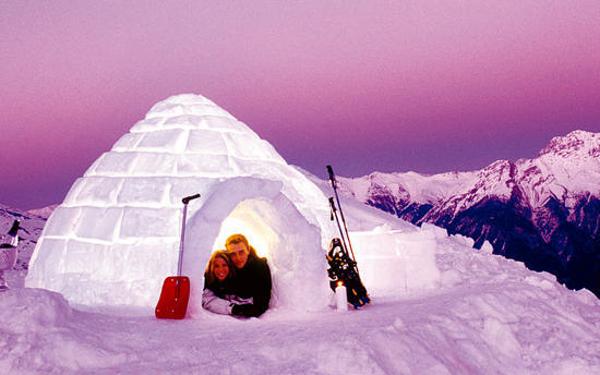 想尝试爱斯基摩人的蜜月感觉吗?在大陆地区已然是夏季的六月里来到瑞士的滑雪胜地体验一把“冰雪酒店”会是个绝妙的创意。酒店坐落于阿尔卑斯山的山顶,酒店的每个房间都是独立的。最特别的是,所有的独立房间全部由冰雪制成。情侣们晚上可以睡在温暖的睡袋里,还可以在冰雪打造的温泉池中享受绝对私密的时光。这里的温泉只供蜜月夫妇享用,抬头就是湛蓝的天空。整个房间除了鸟儿和清风可能不期而至之外,绝对无人打扰。