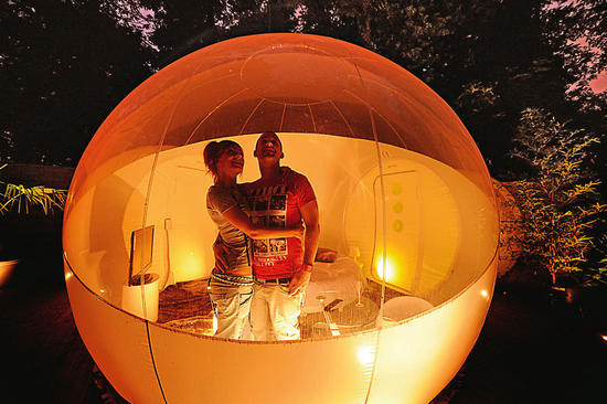 2011 年7 月26 日,位于法国北部的小城parc of Roubaix推出情侣环保气泡房。这个房间几乎是透明的,全部用环保可回收的塑料制成,而且它的充气过程不会制造任何能量消耗。这个小小的可移动的气泡房间可以出租给情侣们在酒店内或任何自然环境中使用。你们可以选择住在森林边的草地上或潺潺的溪水边,全凭自己的兴致所至。值得说明的是这个小小的房间内有小巧的卧具,还有靠太阳能支持的MINI 电视和台灯。夜晚的时候通体通明,仿佛是飘荡在自然中的一个巨大的萤火虫,感觉非常奇妙。
