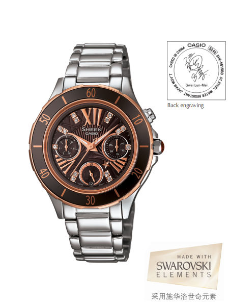 如果你也喜欢低调不张扬的小镁,SHE-3505D-5不可错过!戴上背刻为小镁签名款的SHE-3505D-5,倾听、记录你的故事。它就像每个成熟内敛的女人,不夺目,却禁得住最挑剔的品位。褪去黑色的冷酷,红色的张扬,SHE-3505D-5在配色上,采用深沉的褐色表盘与表圈,令一切细节设计更为突出,闪耀的施华洛世奇水晶如暗夜星辰,向你诉说那段令人怀念的时光。搭配干练简洁的风衣,或者剪裁考究的大衣,展现都市OL的优雅与自信。