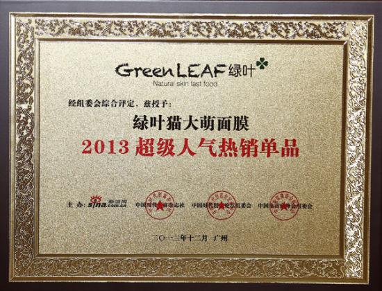 2013年12月21日,由新浪网、新浪广东、中国时代创富论坛组委会、《时代创富》杂志联合主办的第五届中国电商高峰会暨第十八届时代创富论坛在广州成功召开。会议期间,“2013超级人气热销单品”颁奖盛典同步举行。据悉, “2013超级人气热销单品”是由《时代创富》牵手新浪网,参照线上推广、类目优势、前景优势、品质口碑、综合平台优势等标准,并引入微博、微信互动,综合评选而得出。科玛集团绿叶品牌继去年深层净透卸妆油获得淘宝类目销售第一后,今年原创猫大萌面膜,又摘得“2013超级人气热销单品”桂冠,形成绿叶爆款群。