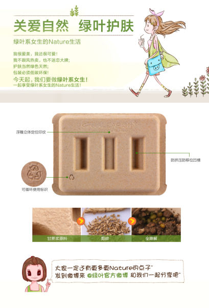 绿叶热爱并尊崇大自然,一直坚持环保的初心,感恩所有来自大自然的原料和创意灵感。有人可能笑我们太执着,正是这份不变的初心,才让消费者感受到产品与肌肤间明媚的愉悦和我们的诚意。面对资源极度浪费的今天,绿叶号召你、我、她关爱自然,绿色环保从我做起,从点滴做起,让环保成为一种时尚一种生活态度。绿叶创意的国家专利环保盒,可全降解,将环保盒剪碎放入盆栽内可作花泥滋养植物枝繁叶茂,简单三步变身环保天使,享受环保Nature生活。