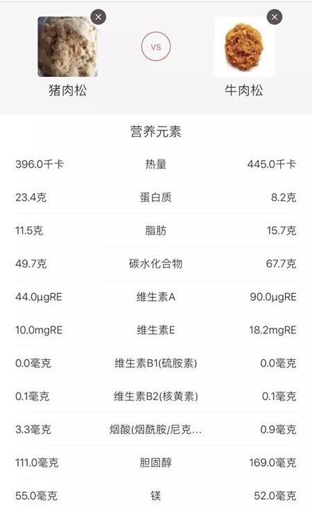 虽然猪肉松的热量比牛肉松高一些,但是蛋白质含量却是牛肉松的3倍,脂肪和胆固醇也比牛肉松少,碳水化合物的含量也低于牛肉松。