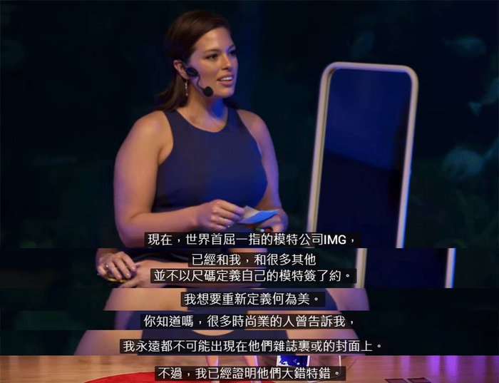 Ashley被请去TED演讲时,一开场她就对着舞台上的一面镜子,和自己背上的赘肉、粗壮的大腿、臀部的橘皮组织喊话问好,感谢它们的存在成就了今天的自己。