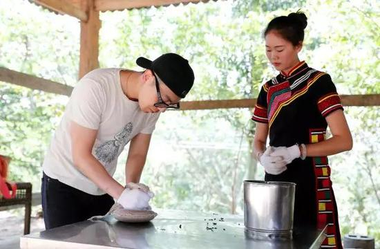 不过采摘鲜芽叶仅仅是制茶的开始,朱亚文还亲自体验了压制茶饼的过程。先称好357克的干毛茶,然后放入蒸茶机让茶叶变软,再装袋揉饼,最后用石磨压制定型。待冷却之后,就可以包装了。在千年古茶园体验从采茶到亲手做茶,一采一做之间让朱亚文更懂得了茶农的不易,于是他在茶饼的包装纸上写下了自己对茶最深切的表达——惜品。