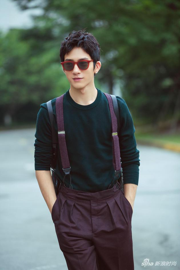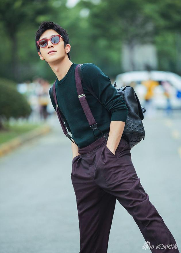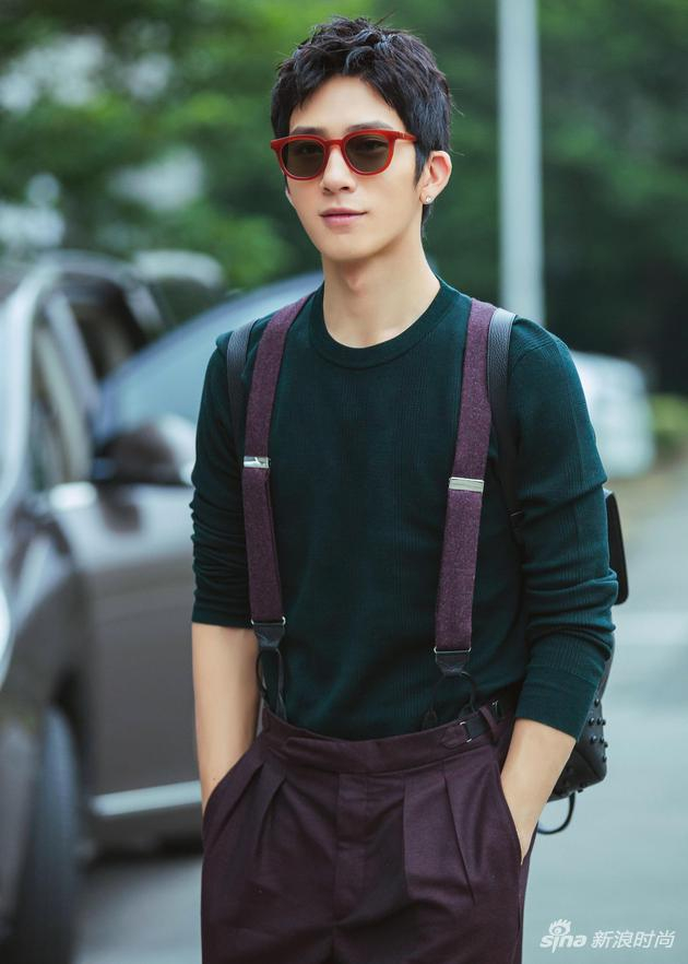 当天,井宝身穿Cerruti 1881 2017秋冬系列男装搭配Gentle Monster亮红色边框墨镜,酒红色背带裤搭配针织上衣,干净阳光,少年感十足。