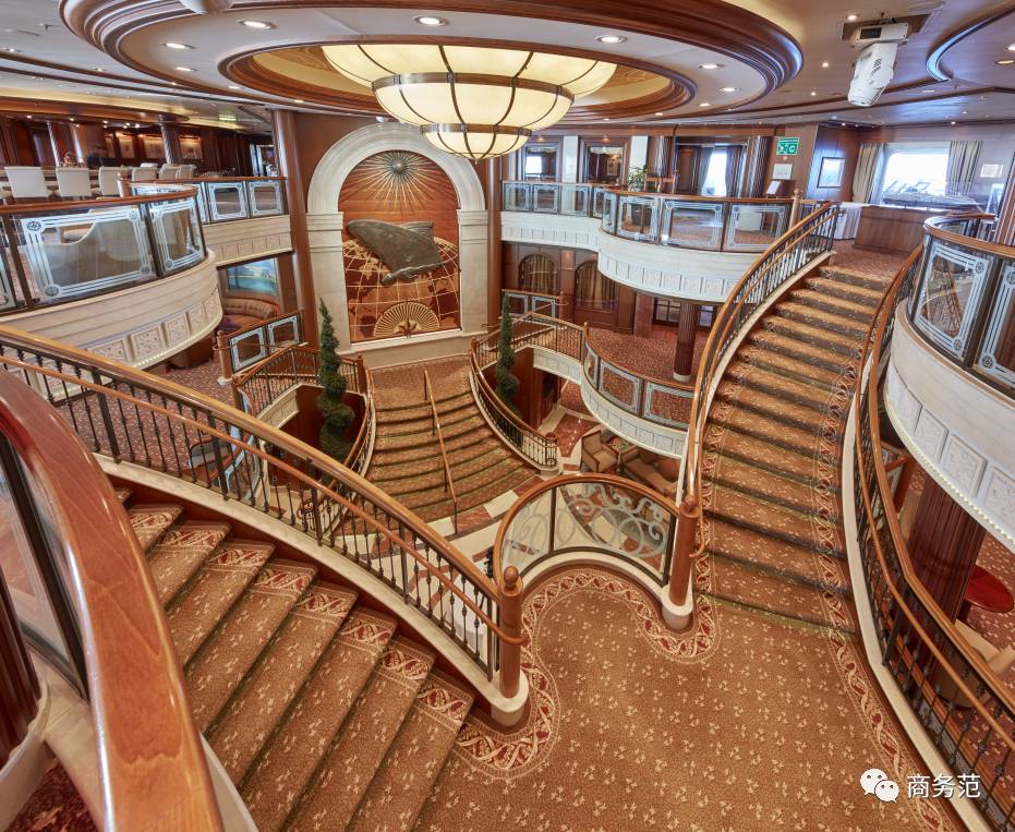 船上的娱乐设施也是多种多样,非常著名的是恢弘的双层图书馆,木制嵌板,颜值颇高,在远离尘嚣的大海上,静静地读书,这才是不同于普通中产的放松方式。