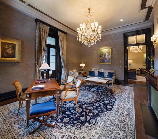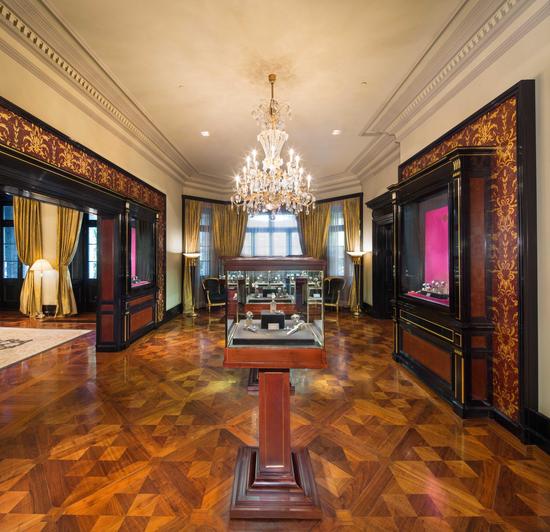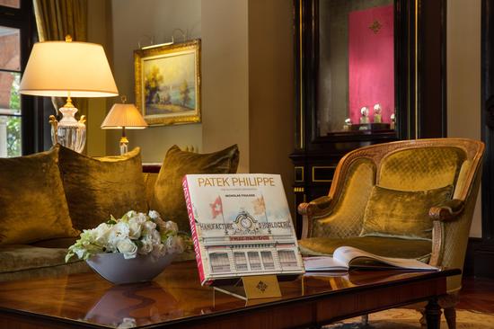 为了让“源邸”呈现百达翡丽的文化和价值理念,内部设计风格必须与日内瓦沙龙一脉相承,百达翡丽荣誉主席菲力·斯登的夫人——歌蒂·斯登女士亲自承担了源邸的室内设计的重任,为此全情投入,亲力亲为,大到设计方案,小到亲自测量楼梯尺寸,甚至是窗帘褶皱的最佳个数。总面积超过1200平方米的源邸,呈现了拿破仑三世装饰风格,兼具路易十六风格的古典家具和装饰性藏品。源邸一楼的水晶大吊灯,定制于法国皇室御用品牌Bagues,是专门为百达翡丽源邸设计的独一无二的作品,并经6个月的时间纯手工打造而成。墙壁上以日内瓦湖为主题的历史油画,也都是家族的私人收藏。