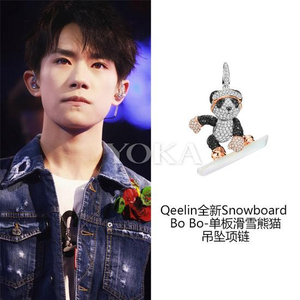 易烊千玺身穿牛仔外套搭配佩戴Qeelin全新Snowboard Bo Bo单板滑雪熊猫吊坠项链,为整体造型增添动感元素,大佬的时尚感太强啦!