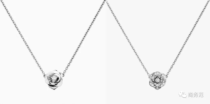 最经典的是有着层层叠叠饱满花瓣的钻石玫瑰吊坠。镶嵌一颗钻石的项链价格为¥ 15,600(左),如果是36颗钻石镶嵌于整个花瓣的款式,价格为¥ 33,200(右)。