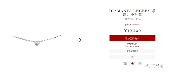 如果是喜欢一些单钻款式项链的范友,Cartier的Diamants Legers系列也是不错的选择。根据钻石大小不同,从6K到2W价格不等,款式简单也百搭。18K黄金、白金、玫瑰金这三种基础材质都能选到。