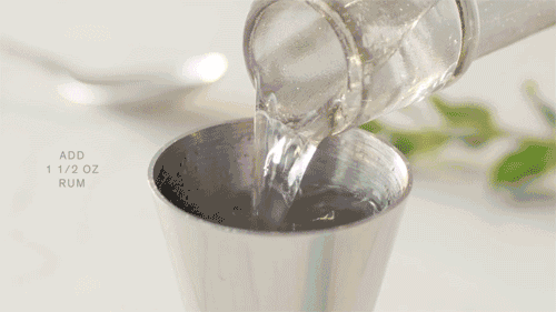 4、加入青柠汁和两枝薄荷叶,浸泡12-15分钟后取出薄荷叶枝,加入朗姆酒