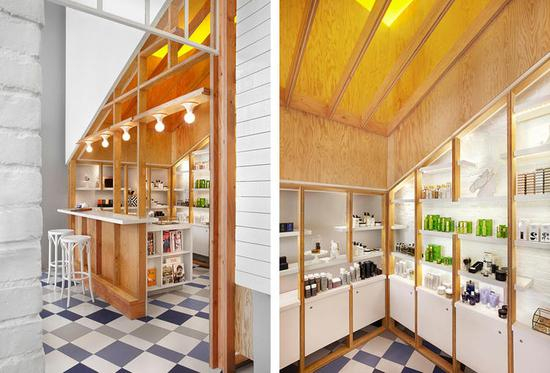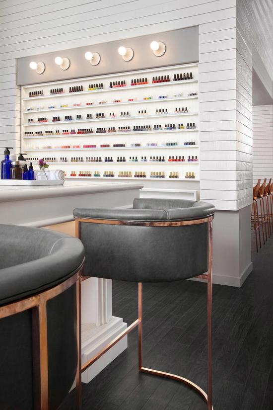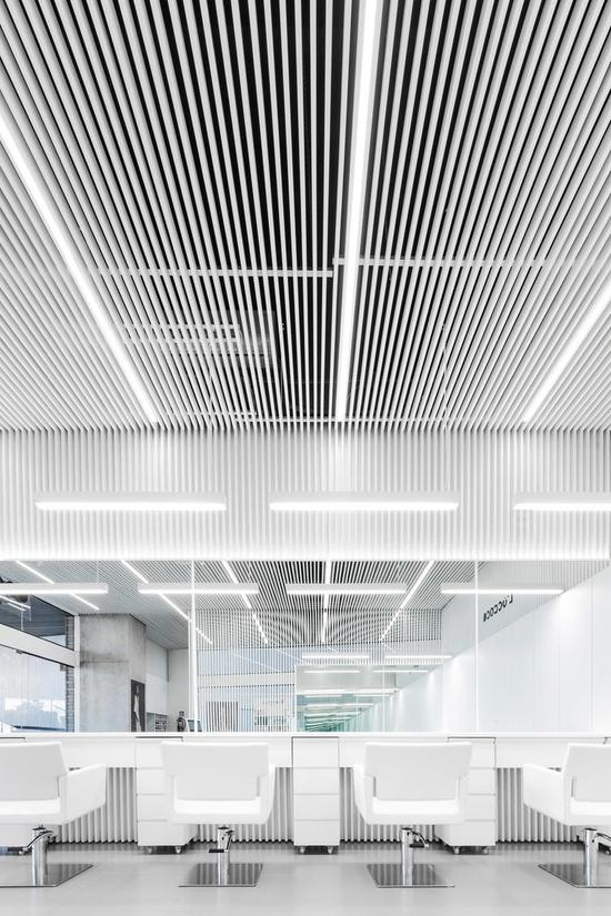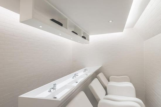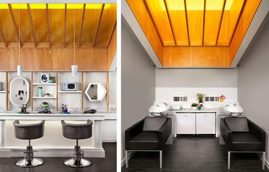 经过咖啡厅、酒吧区及精品小店后便到了美容美发区,这个区域的上方天花安装了类似谷仓建筑般的坡屋顶,通过现代式的灯光设计,传统的木架子被极具前卫的打亮。另外一侧相对独立的修脚区域的屋顶也做了类似处理。其中白色墙面上的绿色植物与白色桌椅上的蓝色椅垫调和了天花的橙色与地板的深色。