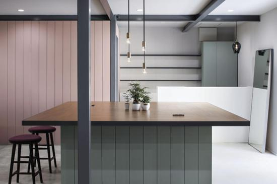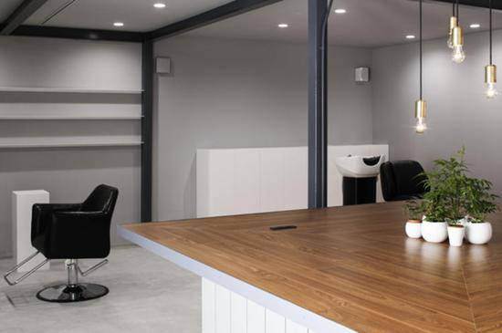 一张大木桌被放在了空间的中央,顾客们可以在这里坐下看看杂志,或者喝一杯咖啡。开放式的设计给人轻松的观感,宽敞又宁静,此外还提供一些美发书籍。除了一个内部工作间,它是一个没有隔断墙的连续空间。为了给人一种统一的感觉,通过限制使用的材料和颜色,以及利用现有的钢柱和梁,尽可能将设计元素简化。