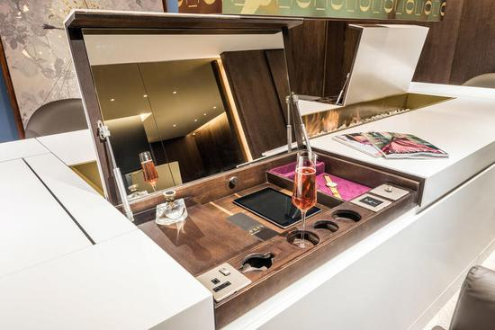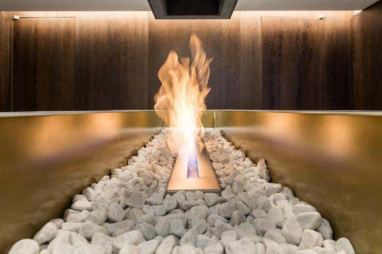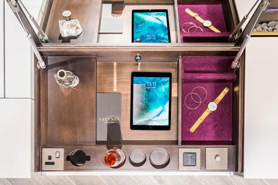 JaK Studio 使用了蓝色及白色作为主要色调,再以金色的装饰点缀空间。最为焦点的空间为 Fire Pit,顾客可以在此空间聊天、放松心情以及享受理发的过程。上方有醒目的金色装饰,岛台中有定制的首饰盒,这个盒从柜面上打开,它考虑到顾客的不同情况而设计,包括镜子、摆件位置、放杯位、化妆位,发型师工具摆位、充电位等等,在不需要使用时可以闭合。