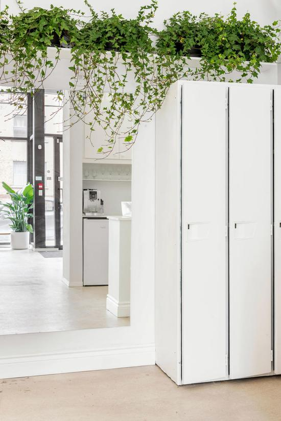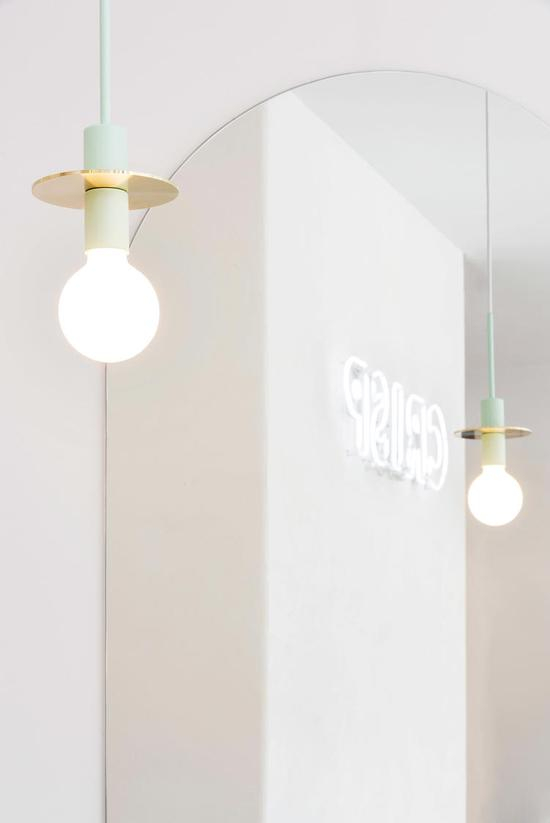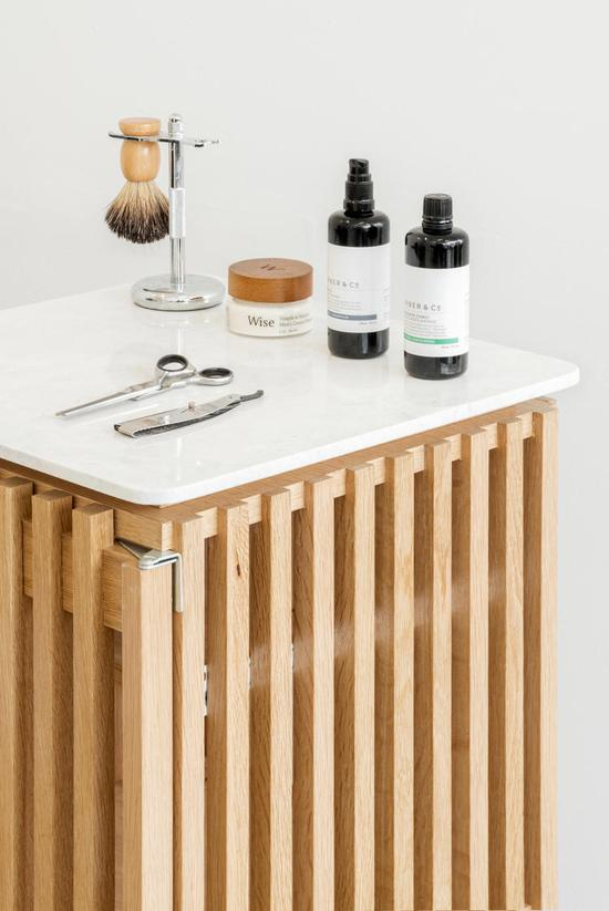 设计师想要尽可能呈现这个空间的原貌,把地板下面的混凝土地面彻底露出来,墙面刷成白色,给整个环境制造出一个中立色的背景。梳妆台沿着墙壁排开,拱形镜子也在地面上一字排开。镜面前面的板条橡木箱子是 Ivy Studio 专门为 Crisp 定制设计的,专门用来收纳盒存放理发师的工具。当店内需要举办一些活动的时候,这些匣子可以移开,让整个空间更加开阔。