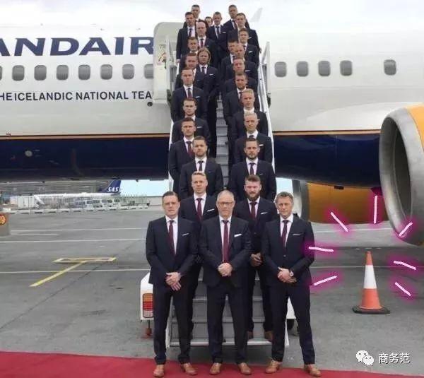 屡创奇迹的冰岛队身穿灰蓝色西装搭配海军蓝西裤,细看也没什么硬伤,但是这站姿…不知道的还以为是机组人员合影,或者某银行员工接受领导视察_(:з’∠)_