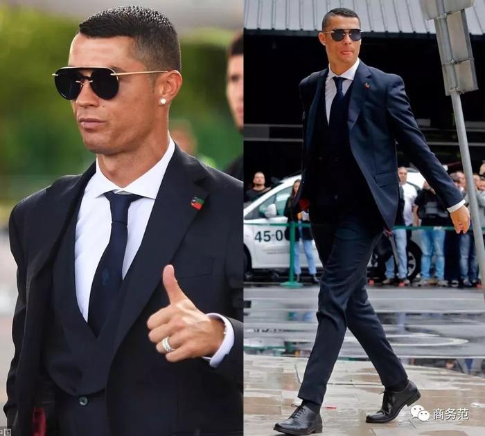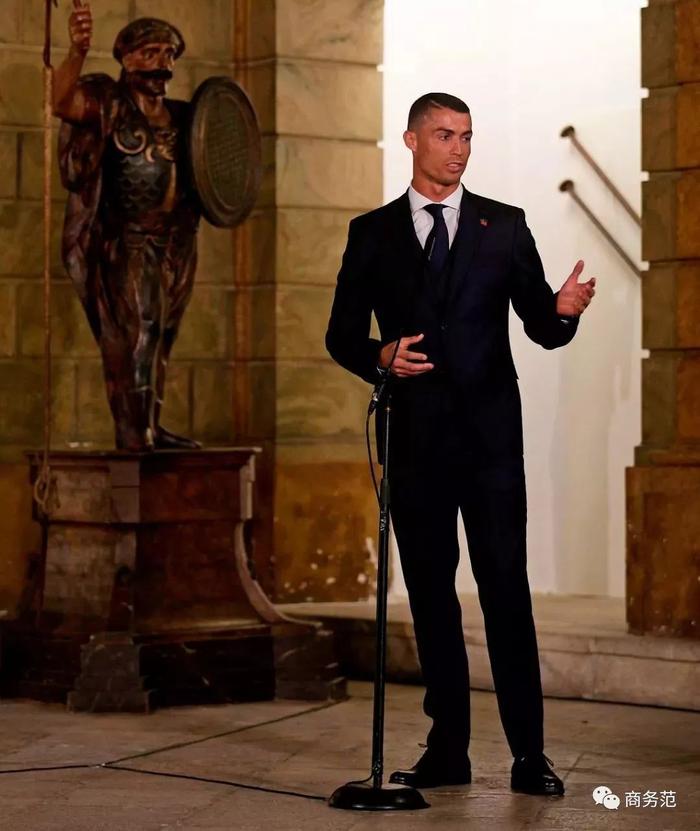再附上一张C罗的单人照,出征俄罗斯之前,葡萄牙队获葡萄牙总统接见,C罗也是笔挺西装,腿长两米八。