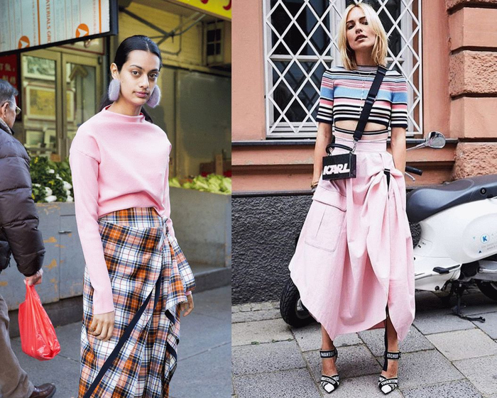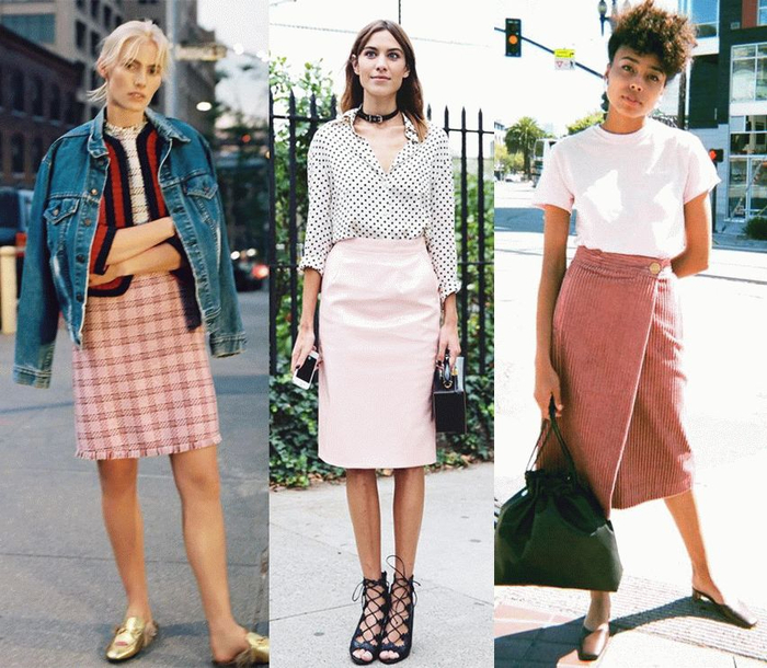 粉色半裙也很值得入。如果想要避免太低龄的效果,可以选一些直身的或是包臀的款式。长度嘛~~及膝自然显成熟了!