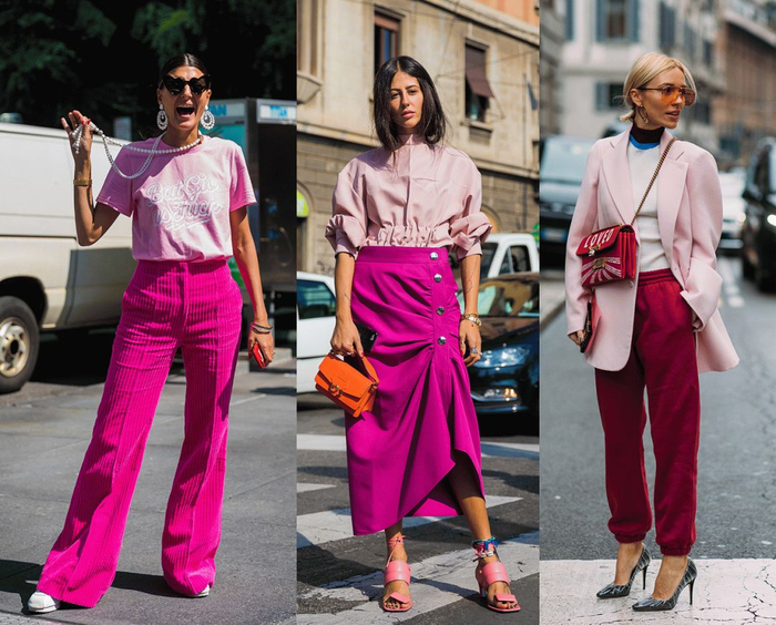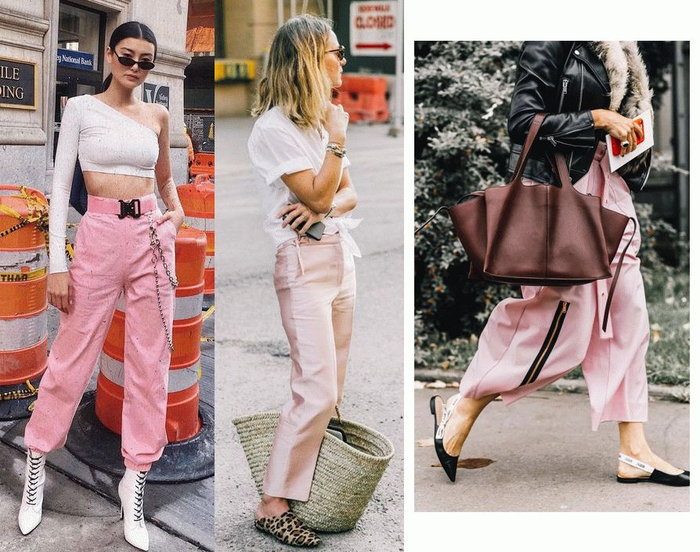 比起裙装的女人味,粉色裤装就帅气多了。而且当下时髦的裤子,就是要不紧身啊!收脚口的工装裤、阔腿裤,都是时髦好物!