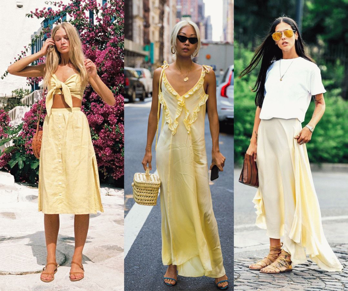 小鸡黄的裙装也还挺好看,但是不同材质效果还是有很大区别。像左图的棉感面料,就会更年轻,更充满活力;中间和右图的缎面材质就会比较轻熟,显得更有女人味。