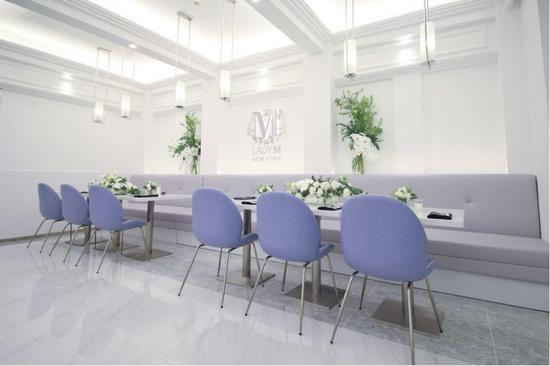 门店位于朝阳大悦城二层。辨识度极高的纯白色与罗兰紫色的桌椅格外瞩目;大理石质地的银色线条勾勒出的 M 则尽显优雅;而作为目前唯一一家融入中国古典元素的门店,Lady M 通过在花板处的装饰线与吊顶的金色线条,复现了中国古代建筑飞檐斗拱的内敛与飘逸,一展古典灵感与现代材质特有的和谐与矛盾——统一中蕴含变化创新,细节内彰显匠心独具,正如 Lady M 的蛋糕滋味般,丰富而迷人。