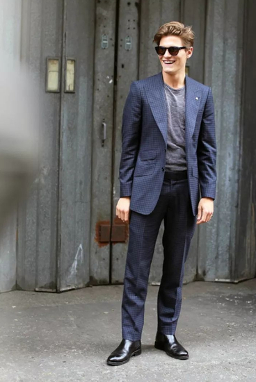 2、棕色切尔西靴: 浅色或中性色西服,可以是包括斜纹软呢在内多种材质。直筒牛仔裤+休闲或正式衬衫/POLO衫。
