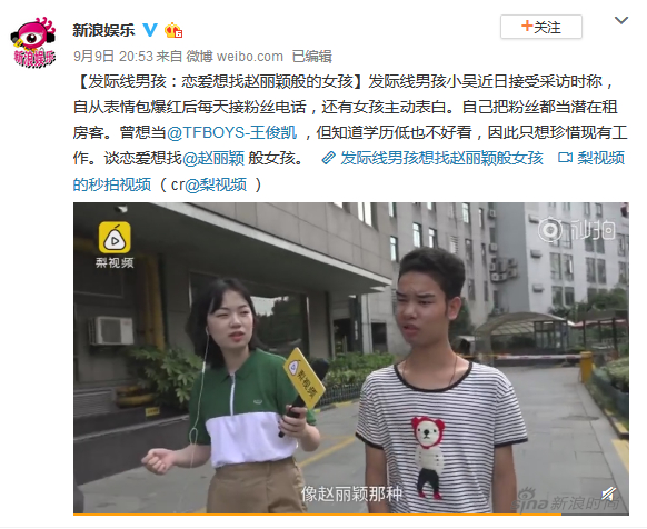 发际线男孩小吴恰好曾自曝过“恋爱想找赵丽颖般的女孩”,网友戏称“有人模仿我的眉毛,还模仿我喜欢赵丽颖”。