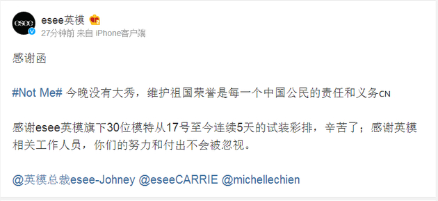 模特公司esee英模发表声明 称维护祖国荣誉是公民义务