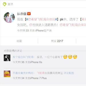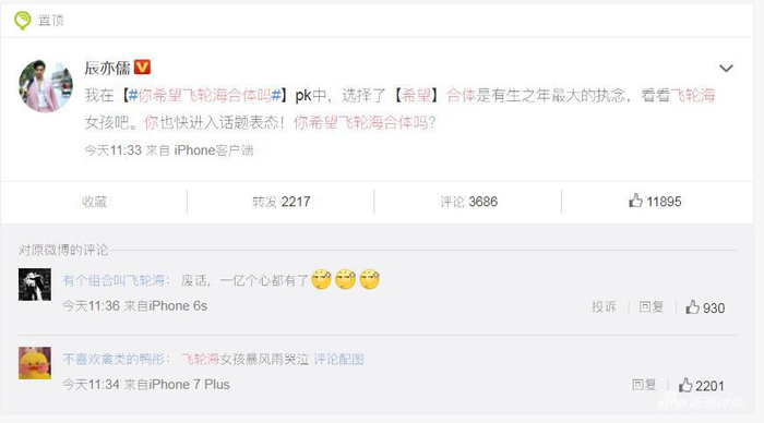 就在成员之一炎亚纶无数次地冲上热搜后,飞轮海几个人也屡屡占据热搜榜。当年的飞轮海女孩/男孩纷纷表态,大呼希望再次合体,身为成员之一的辰亦儒也终于拥有了姓名,在“你希望飞轮海合体吗?”的微博投票中果断选择了“希望”,引起一波狂欢热潮。