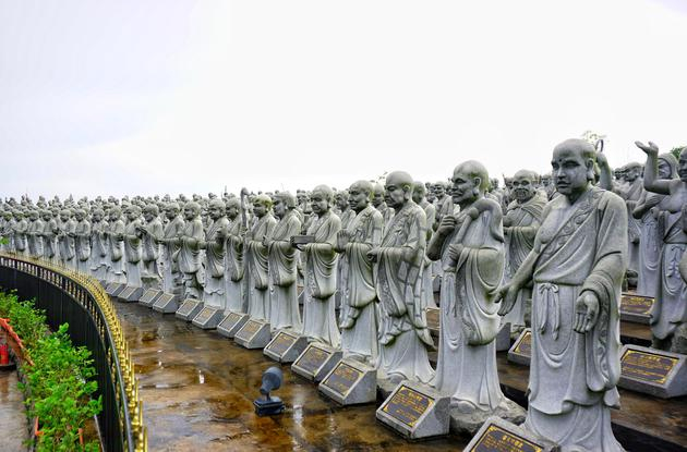 五百罗汉寺坐落在民丹岛的Kijiang,由当地华人集资修建,在2004年动工,历经13年,直到2017年对外开放,不过整修工作一直在持续。罗汉寺宏伟壮观,观赏性极高,最令人震撼的是,寺院内部有500多尊雕刻精致的罗汉石像,他们和真人高度相同,神态各异、栩栩如生。大家仔细观看,竟能找到许多熟悉的面孔。